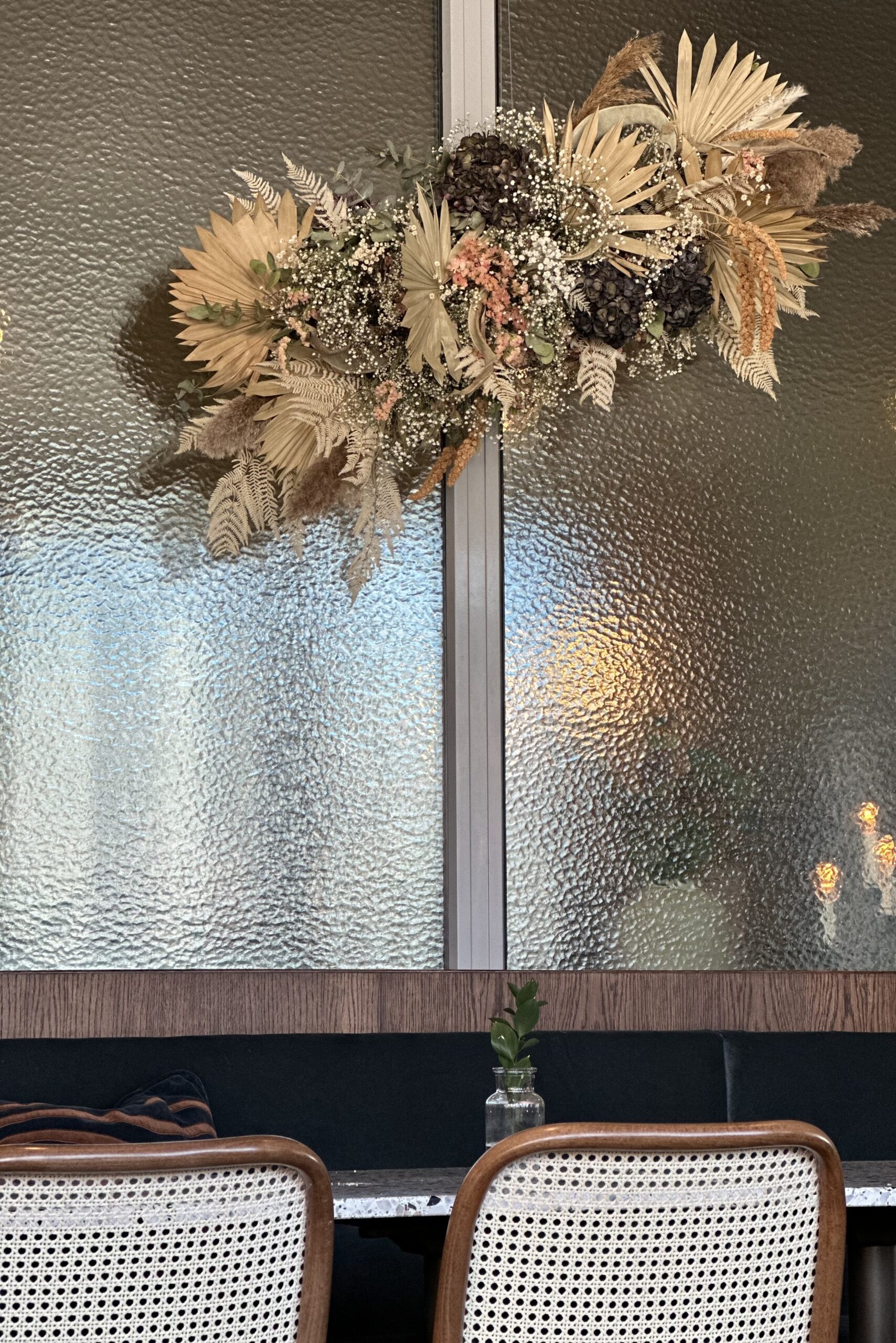 Stort blomster arrangemang som fångar upp känslan och färgerna i salongen. Handgjorda pappersblommor av kräppapper.